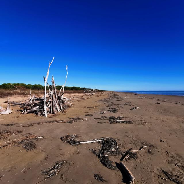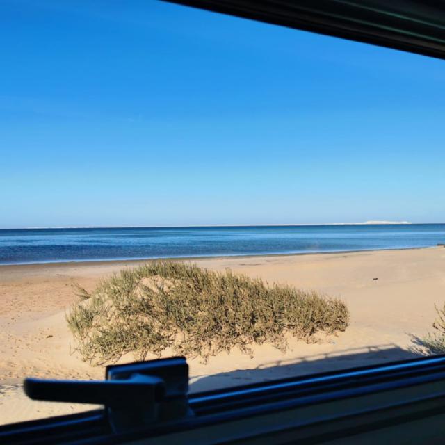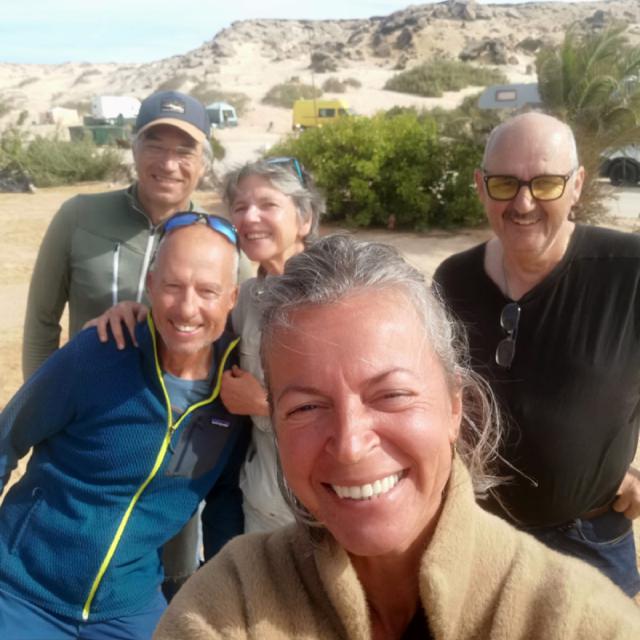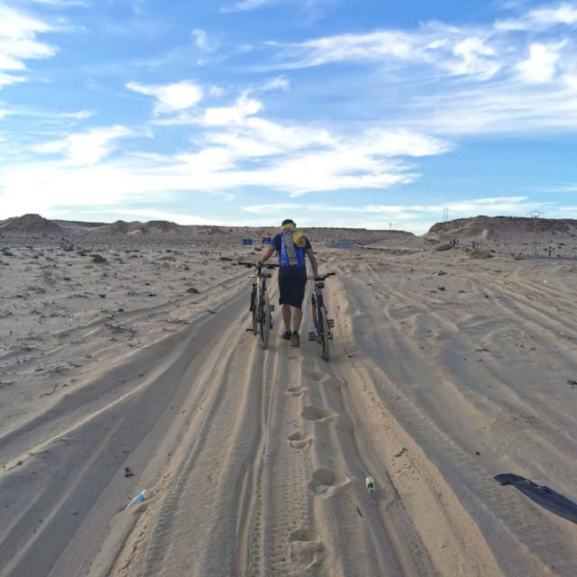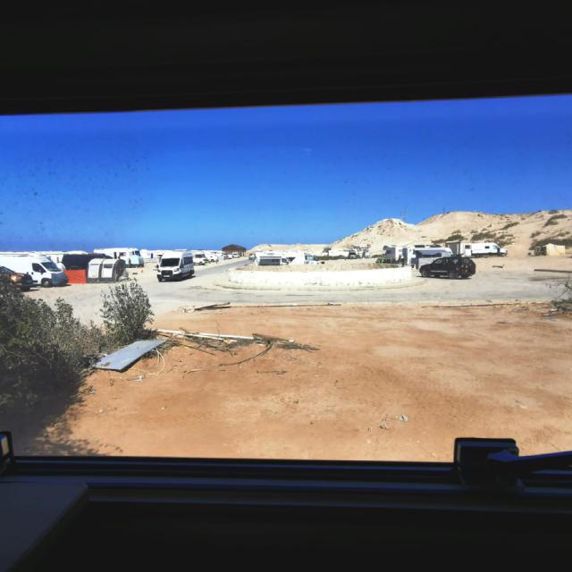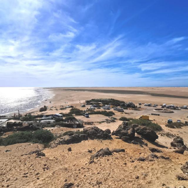 Wir müssen dringend mal raus aus der Kabine, in der wir den Großteil der letzten 3 Tage verbracht haben. Hier hat es zwar tagsüber 20 Grad, aber es weht auch durchgehend ein kräftiger Wind aus Nordost, der alle Aktivitäten draußen ungemütlich macht. Außer man wäre Kitesurfer oder Wingfoiler, für die ist das hier ein Paradies, weshalb es hier auch viele Kitesurf-Hotels gibt. Mit den Rädern machen wir uns auf den Weg zu Toni und Nabu an den Strand. Eigentlich sind es nur 36 km, aber wenn der Untergrund zur Hälfte weicher Sand ist und man gegen 35km/h Wind fährt, kann man das durchaus als Sport bezeichnen. Fix und fertig kommen wir (nein ich) abends wieder am PK 25 an.